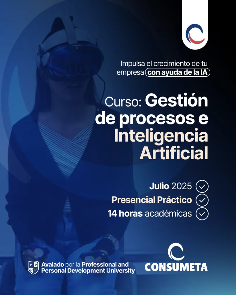 El curso Gestión de Procesos e Inteligencia Artificial de CONSUMETA es una experiencia formativa de 14 horas académicas que transforma la eficiencia operativa en ventaja competitiva. A través de dos módulos intensivos, los participantes aprenden a mapear, rediseñar y optimizar procesos clave, integrando herramientas de IA para automatización, análisis predictivo y mejora continua. El resultado: organizaciones más ágiles, inteligentes y sostenibles.